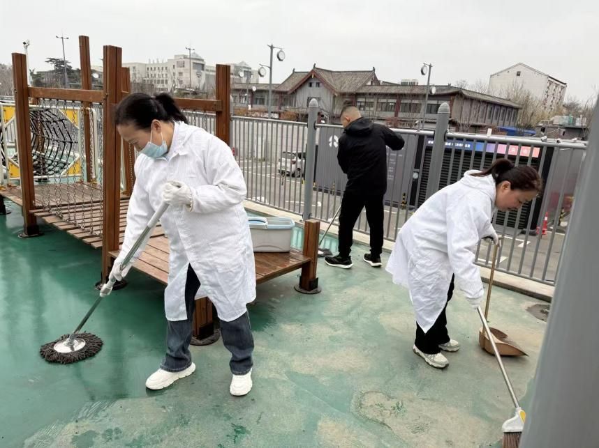 安全与卫生是幼儿园工作的底线。全体教师对室内活动室、盥洗室等区域进行无死角清洁,细致擦拭幼儿桌椅、玩具、绘本等物品;对园区地面、走廊扶手、大型户外玩具等高频接触部位进行全面消毒,有效阻断病毒传播途径。经过全体教职工的协同奋战,园所环境焕然一新,为幼儿健康筑牢坚实屏障。